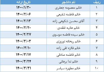 اسامي و ترتيب ارائه ژورنال کلاب نیمه دوم 1400-1399مجازی و حضوری (در صورت تمایل) به شرح زیر،ساعت 12:30 الی 14 و در آزمایشگاه فناوری اطلاعات سلامت برگزار می گردد. |