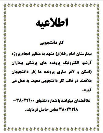 اطلاعیهکار دانشجوییبیمارستان امام رضا (ع) مشهد به منظور انجام پروژه آرشیو الکترونیک پرونده های پزشکی بیماران (اسکن و لاغر سازی پرونده ها) از دانشجویان علاقمند در قالب کار دانشجویی دعوت به عمل می آورد. علاقمندان می توانند با شماره تلفنهای 38022100- 38022198 تماس حاصل فرمایند. |