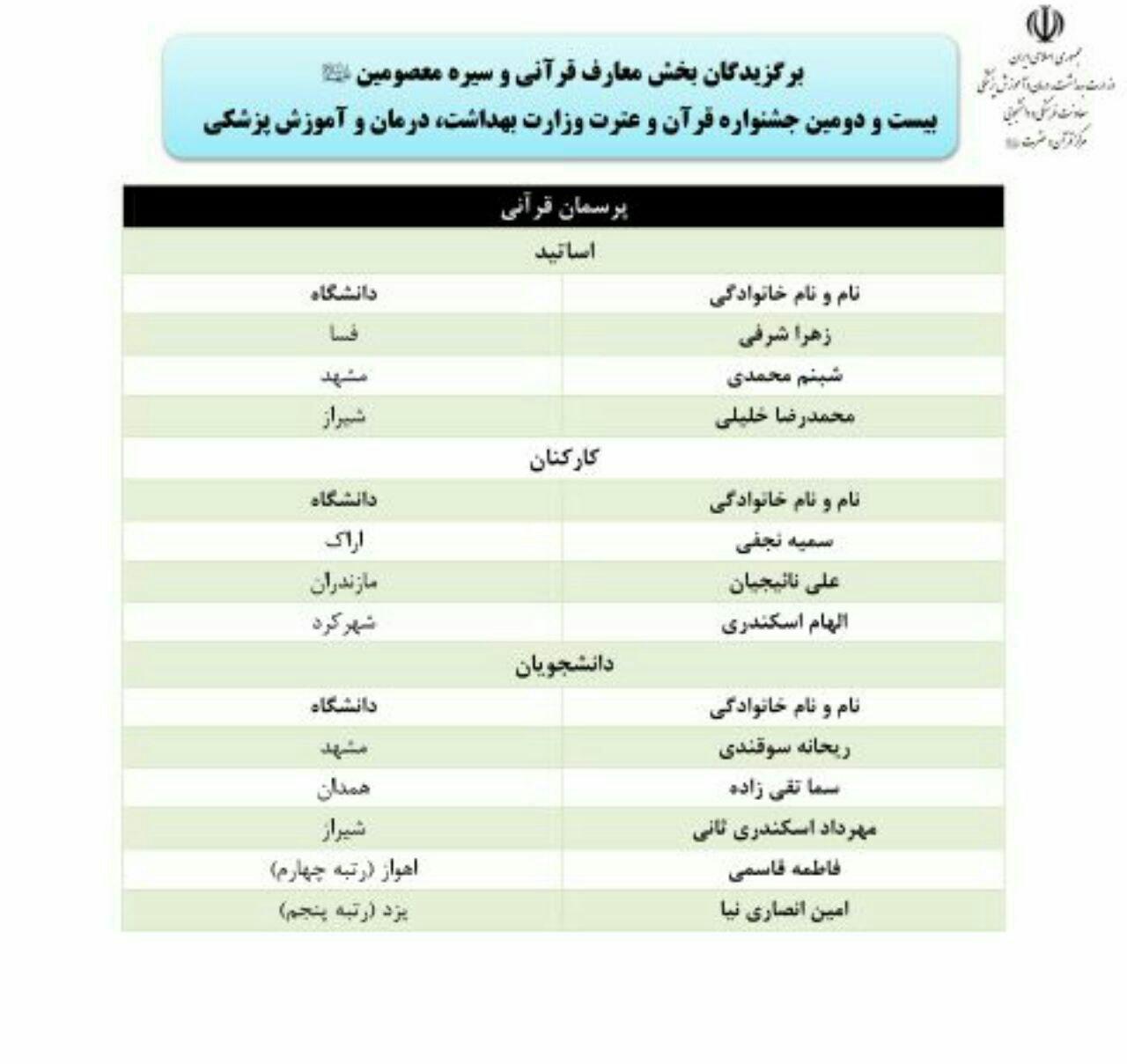 کسب عنوان رتبه برتر کشوری در رشت پرسمان قرانی در بیست و دومین جشنواره قران و عترت وزارت بهداشت، درمان و آموزش پزشکی |