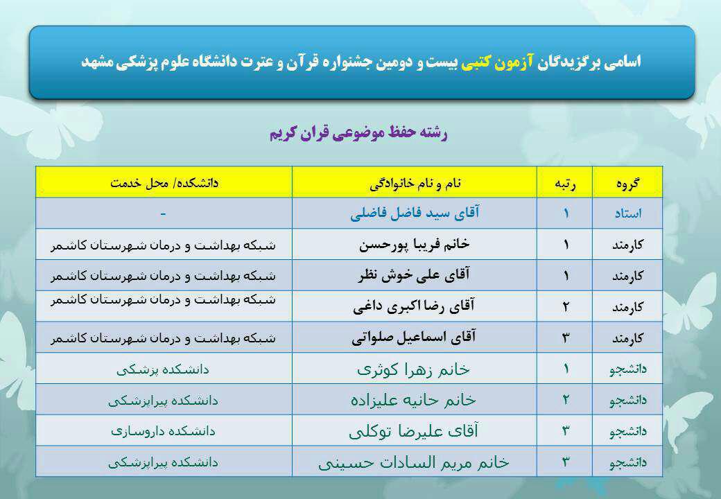 کسب رتبه سوم آزمون کتبی بخش حفظ موضوعی قران کریم در بیست و دومین جشنواره قران و عترت وزارت بهداشت، درمان و آموزش پزشکی |