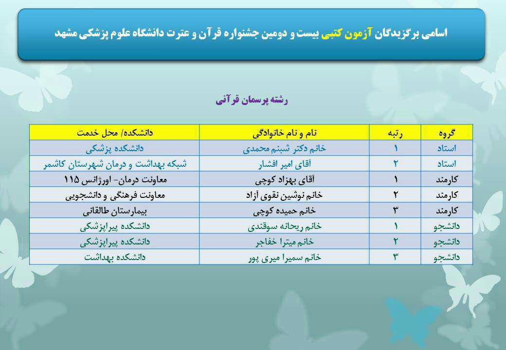 سرکار خانم میتراخفاجه دانشجوی مقطع کارشناسی فناوری اطلاعات سلامت موفق به کسب رتبه دوم آزمون کتبی_ بخش پرسمان قرانی در بیست و دومین جشنواره قران و عترت وزارت بهداشت، درمان و آمزش پزشکی (1396) شدند.