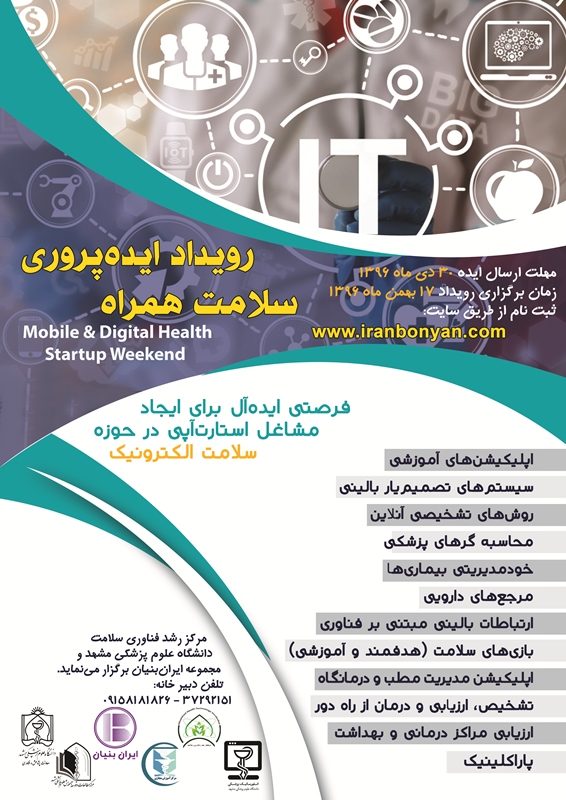 مرکز رشد فناوری سلامت دانشگاه علوم پزشکی با همکاری مجموعه ایران بنیان قصد دارد در تاریخ 17 الی 20 بهمن ماه سال جاری، اقدام به برگزاری اولین رویداد ایده پروری و کارآفرینی سلامت همراه (استارت آپ ويکند) نماید. مهت ارسال ایده تا تا 30 دی ماه و موضوعات ایده ها به شرح زیر می باشد: