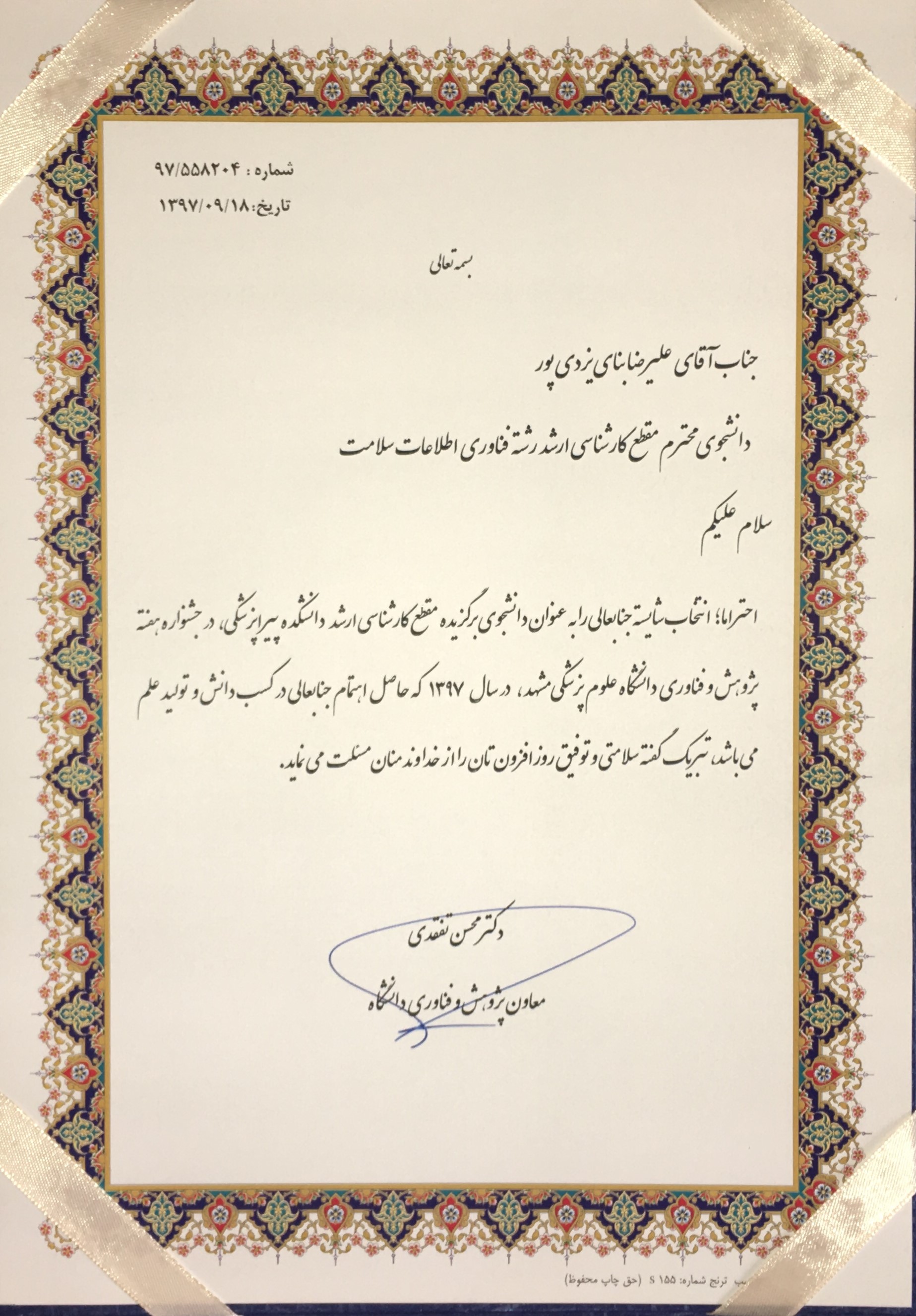 انتخاب شما را به عنوان دانشجوی برگزیده مقطع کارشناس ارشد دانشکده پیراپزشکی در جشنواره هفته پژوهش و فناوری دانشگاه علوم پزشکی مشهد، درسال 1397 تبریک عرض می کنیم. توفیق و موفقیت روز افزون شما را از خداوند بزرگ خواهانیم