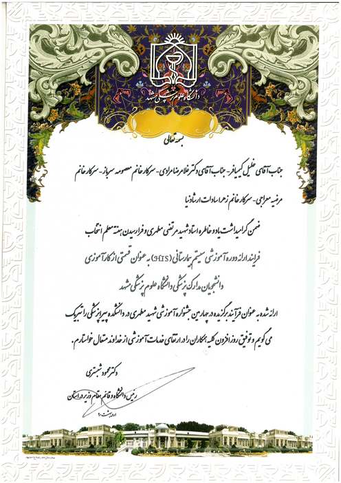 کسب عنوان فرایند برگزیده در چهارمین جشنواره آموزشی شهید مطهری (1390) باعنوان " دوره آموزشی سیستم اطلاعات بیمارستانی HIS بعنوان قسمتی از کارآموزی دانشجویان " توسط اساتید گروه مدارک پزشکی و فناوری اطلاعات سلامت جناب آقای دکتر کیمیافر، جناب آقای دکتر غلامرضا مرادی، سرکار خانم معصومه سرباز، سرکار خانم مرضیه معراجی، سرکار خانم ارشادنیا |