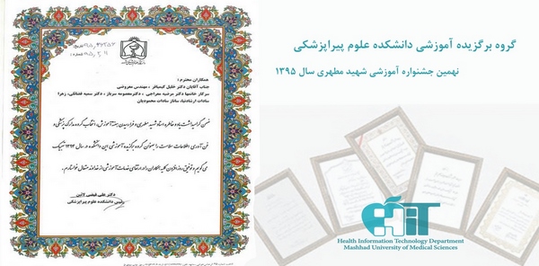 دکتر خلیل کیمیافر، دکتر معصومه سرباز، دکتر مرضیه معراجی، دکتر سمیه فضائلی،زهرا سادات ارشادنیا، ساناز سادات محمودیان گروه آموزشی مدارک پزشکی و فناوری اطلاعات سلامت دانشکده علوم پیراپزشکی دانشگاه علوم پزشکی مشهد با همت کادر هیئت علمی و اداری موفق به کسب رتبه گروه برگزیده آموزشی دانشکده علوم پیراپزشکی در نهمین جشنواره آموزشی شهید مطهری سال 1395 گردید. در این جشنواره هر ساله بر حسب آیتمهای مشخصی کلیه گروههای دانشکده از نظر آموزشی بررسی می شوند و گروههای برتر پس اعلان نظر داوران مشخص می گردند. گروه مدارک پزشکی و فناوری اطلاعات سلامت با کسب حداکثر امتیاز در ایتم زیرتوانست در صدر گروه های آموزشی دانشکده قرار گیرد: اجرای ارزشیابی درونی،تدوین و اجرای برنامه استراتژیک و عملیاتی تهیه طرح درس برای اکثر دروس و اصلاح ترم بندی ارائه کتابچه راهنما ، لاگ بوک و غیره برای دانشجویان پیاده سازی فرایندهای فعال یادگیری و یاددهی انتشار بيش از 20 مقاله و طرح تحقیقاتی در همایش های داخلی و بین المللی و مجلات در حوزه آموزش پزشکی طراحي نرم افزار آموزشي تحت وب براي کارکنان باليني بيمارستان ها در مورد کنترل عفونت |